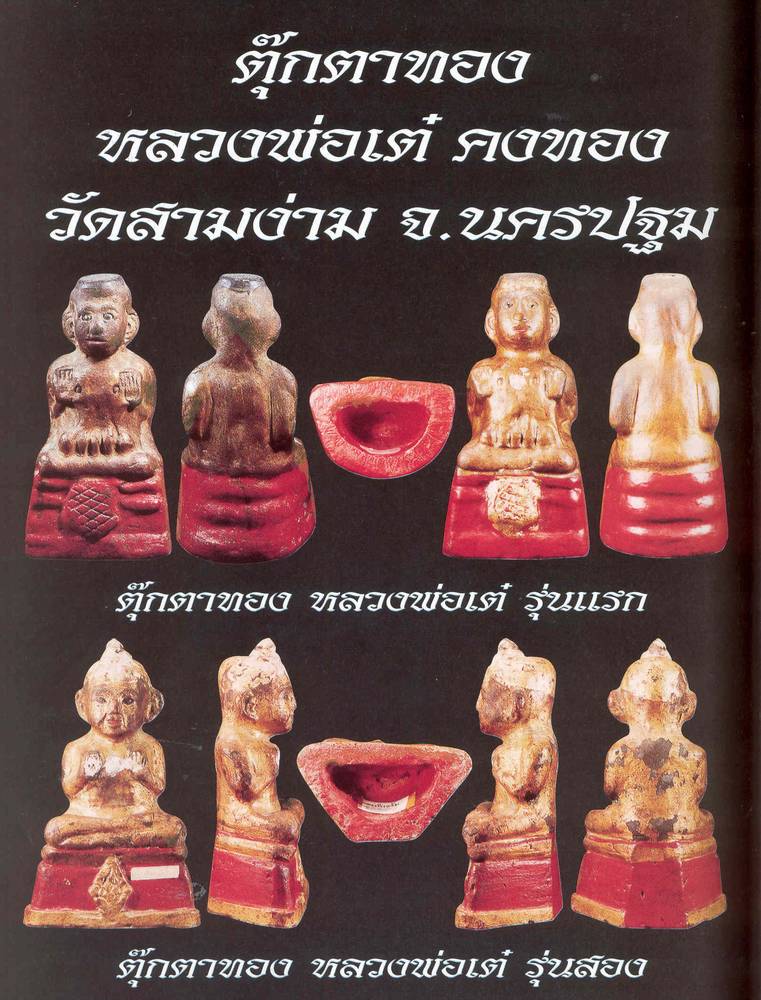 กุมารทอง กุมารทองหลวงพ่อเต๋ กุมารทองวัดสามง่าม คาถาบูชากุมารทอง กุมารทองสยาม กุมารทองหลวงพ่อแย้ม เลี้ยงกุมารทอง คาถากุมารทอง กุมารทองเทพ กุมารทองหลวงปู่แย้ม ที่สร้างที่วัดสามง่ามมีด้วยกัน 4 รุ่น มีหนังสือออกมารุ่นหนึ่ง บอกว่ามีห้ารุ่น แต่ที่เค้าบอกว่ารุ่น 2 หรือ รุ่นสามผมจำไม่ได้ ไม่ใช่หลวงพ่อเต๋ที่ออกที่วัดสามง่ามครับ รุ่นหนึ่งมี 2 พิมพ์ ดังที่พี่ลงไว้ตอนต้น ทำ ด้วยเนื้อดิน(เป็นดินเจ็ดป่าช้า เจ็ดโปร่ง ฯลฯ) รุ่น 2 ที่พี่ต้อยลงไว้ในองค์ต่อมา ทำด้วยเนื้อดิน ลักษณะ เหมือนรุ่น 1 รุ่น 3 เป็นรุ่นฐานผ้าทิพย์ เนื้อจะออกสีชมพู หงายดูใต้ฐานจะเห็นชัดเจน (รุ่นนี้ในหนังสือ เล่มหนึ่ง บอกว่าเป็นรุ่น 4 เพราะไปเอาของวัดอื่นแทรกเอาไว้แต่ต้น) รุ่น 4 จะเป็นพิมพ์ที่เหมือนกับ ของหลวงพ่อแย้มรุ่น 1 แต่ของหลวงพ่อแย้มขนาดจะย่อมกว่าเล็กน้อยครับ ใต้ฐานจะมีกระดาษปิดอยู่